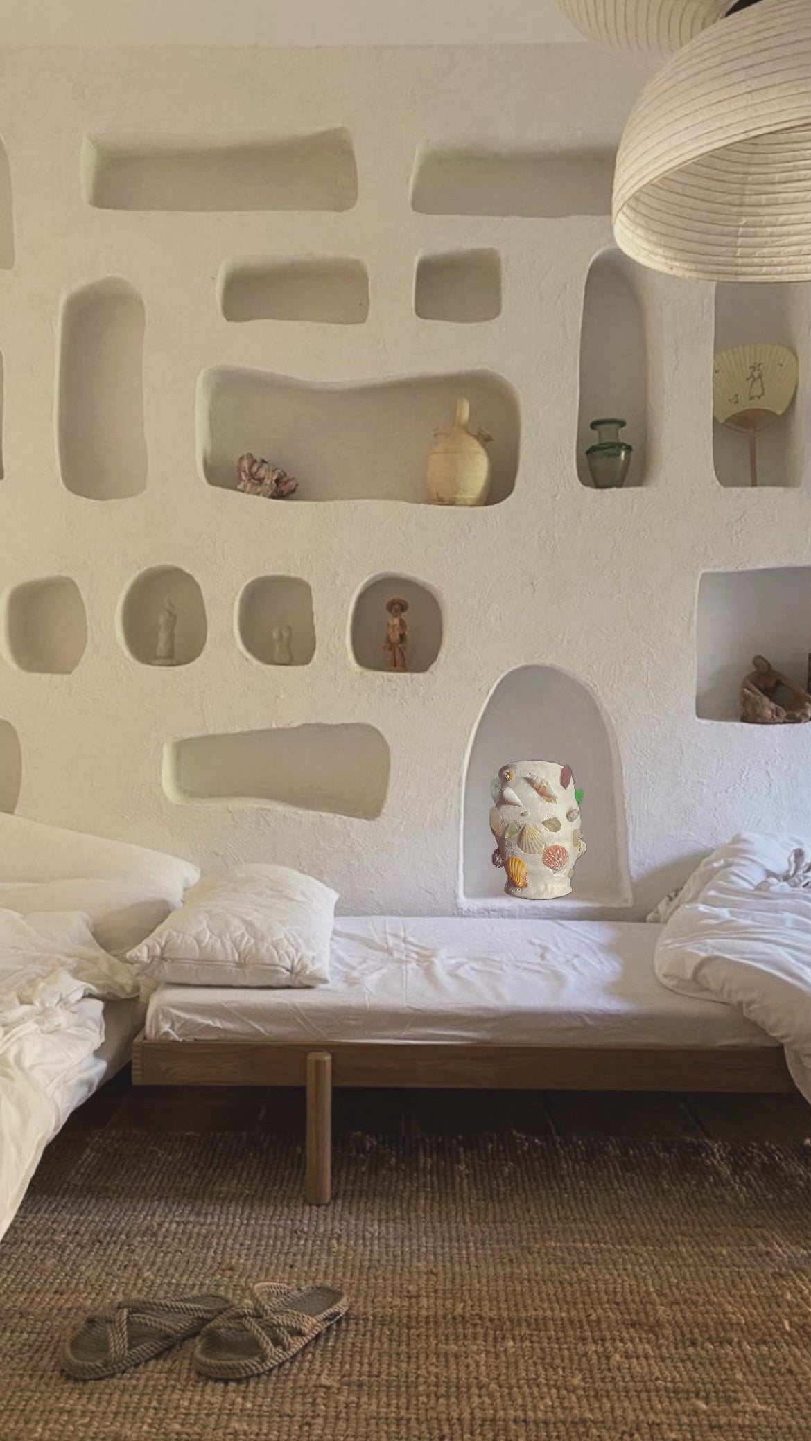 This vase was made using the coil technique, with impressed shells, genuine sea glass, and freshwater pearls. The textures were impressed before the bisque firing, and the details were later attached with E6000 adhesive. Lovingly crafted over several days, ensuring attention to every detail